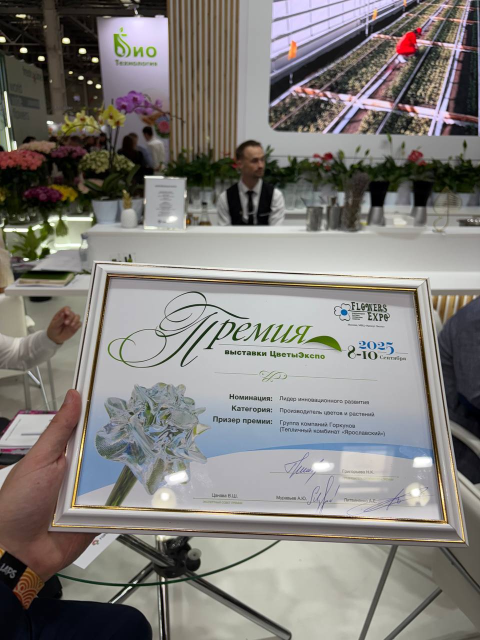 Тепличный Комбинат Ярославский снова на высоте! Мы с гордостью сообщаем, что в этом году мы приняли участие в выставке «ЦветыЭкспо 2025» в Москве и получили заслуженную награду — премию выставки «ЦветыЭкспо 2025» в номинации «Лидер инновационного развития»!