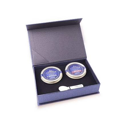 Подарочный набор в который входит: 50 грамм стерляжьей икры, 50 грамм икры осетра, подарочная упаковка, специальная перламутровая ложечка.